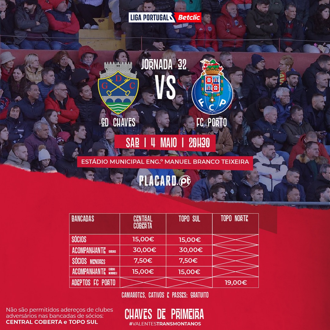 Informamos que já se encontram à venda na Secretaria do GD Chaves os bilhetes para a partida com o FC Porto, relativa à 32.ª jornada da Liga Betclic, que se disputa no dia 4 de maio, às 20h30, no Estádio Municipal Eng.° Manuel Branco Teixeira, em Chaves.