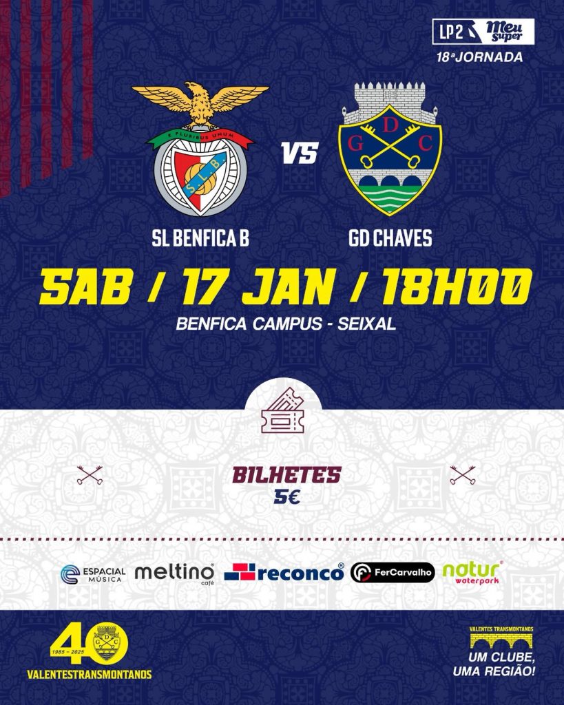 Bilhetes para o SL Benfica B – GD Chaves à venda no dia do jogo, nas bilheteiras do Benfica Campus, no Seixal.