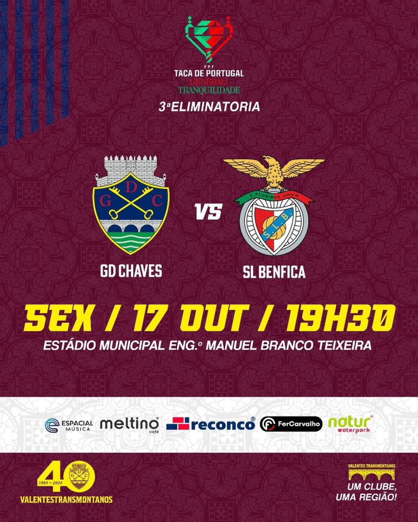 Informamos que o jogo entre o GD Chaves e o SL Benfica, a contar para a 3.ª eliminatória da Taça de Portugal, será disputado no dia 17 de outubro (sexta-feira), às 19h30. Em breve divulgaremos informações relativas à bilhética do encontro.
