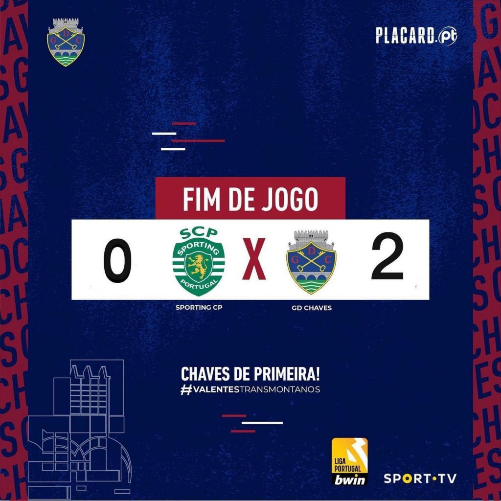 Liga Portugal Bwin Sporting CP 0 GD Chaves 2 Em partida da 4.ª jornada, o Desportivo triunfou em Alvalade, por 0-2, naquele que foi o primeiro triunfo da sua história na casa do leão. #valentestransmontanos