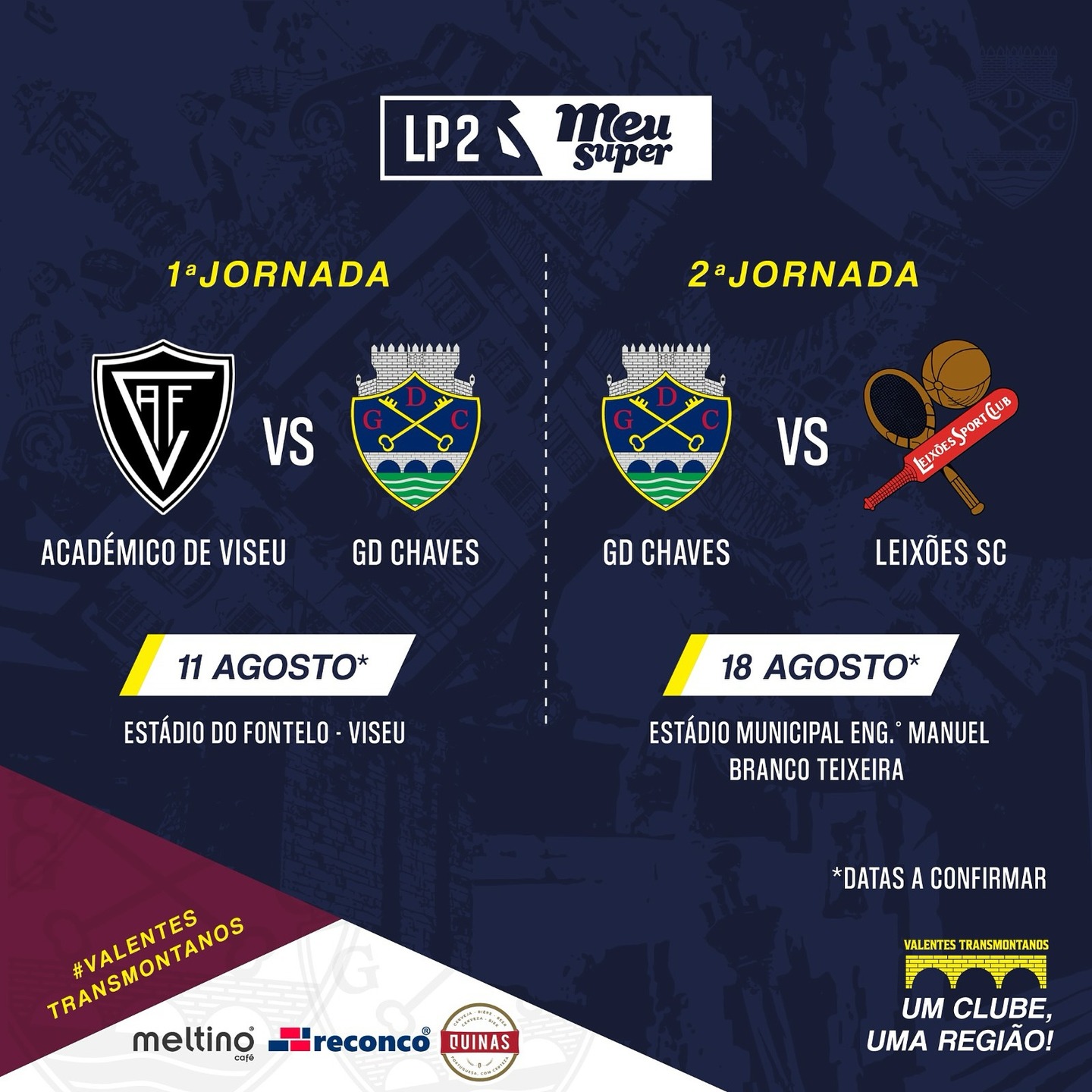 O Grupo Desportivo de Chaves inicia o campeonato 2024/25 no reduto do Académico de Viseu, no fim-de-semana de 10/11 de agosto. Uma semana depois, os Valentes Transmontanos fazem a sua estreia em casa, na receção ao Leixões SC.